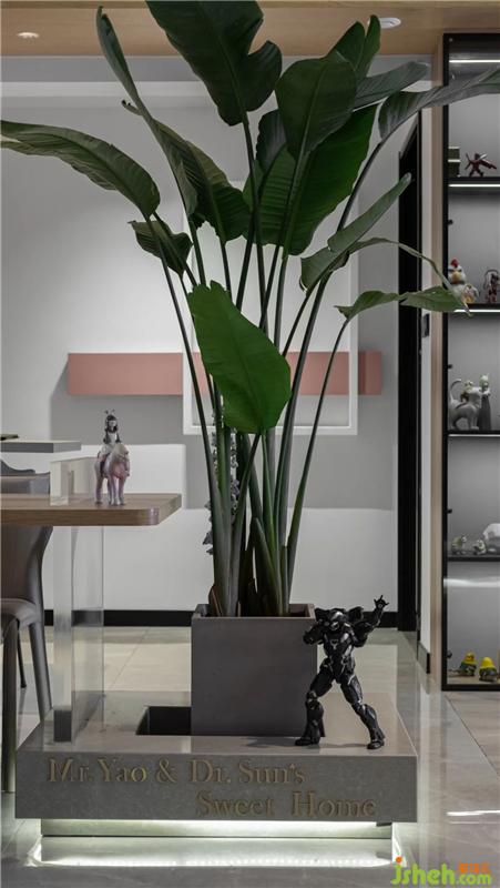 在入戶景觀植物的基座上,有屋主二人的專屬logo,是甜甜的小心思與愛意。并與亞克力的餐桌腿之間做了通透的銜接和穿插,成為入戶的亮點。