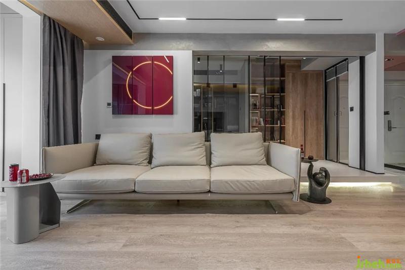 打通了客廳與書房之間的墻體,使整個空間明亮寬敞、開闊通透。照明采用了軌道燈搭配無邊框筒燈,無主燈設(shè)計時尚更具設(shè)計感。客廳的梁、墻面和吊頂用顏色區(qū)分做了互動,體塊之間的穿插突出了結(jié)構(gòu)之間的關(guān)系,增添了設(shè)計與美感。