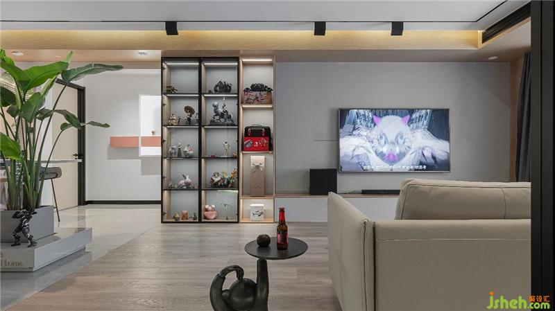 電視背景墻采用大面積深灰色使電視與背景融為一體,5米長的電視墻,也具有儲物和展示的功能性,隔斷與內(nèi)嵌燈條相結(jié)合,為背景墻增添了通透和神秘感。