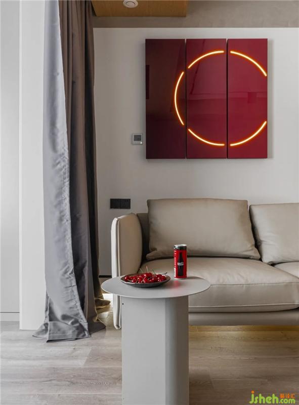 整個空間以白色為底色,搭配水泥漆、高級灰,烘托出素雅、祥和的氛圍。沙發(fā)背景墻上懸掛定制藝術(shù)裝飾畫——極光之美,點明了整體空間的主題,科技與藝術(shù)并存,實現(xiàn)在家就可以欣賞極光的美麗愿望。
