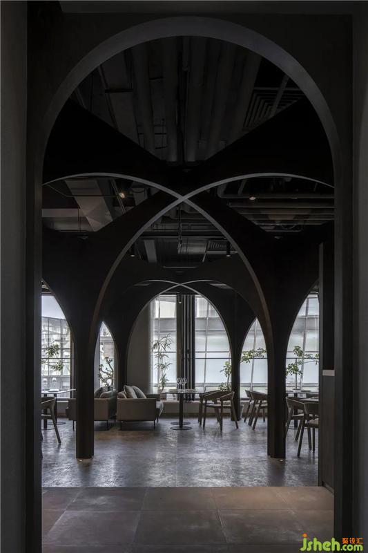 每個(gè)十字拱由地面向上生長(zhǎng),延伸至頂面交錯(cuò)至另一側(cè)落下,創(chuàng)造出半私密的“繭”式空間環(huán)境。
