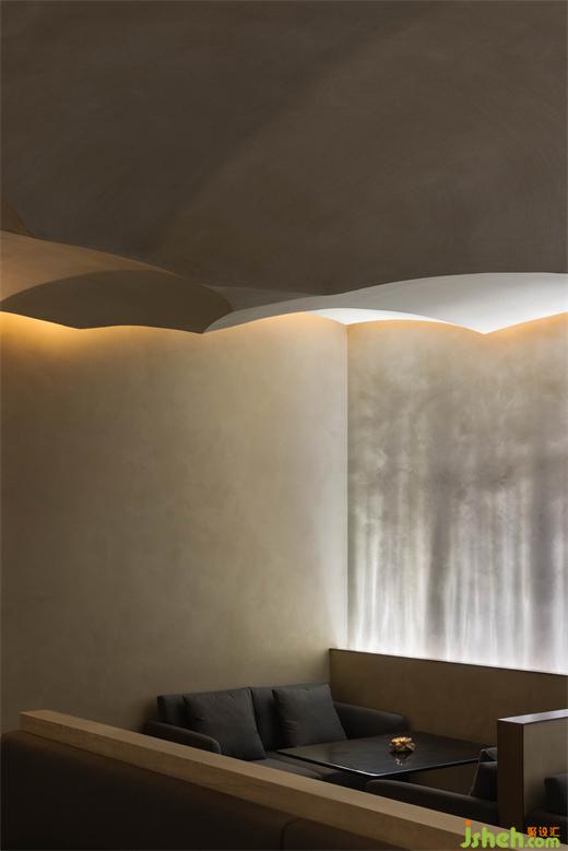The straight linear light along the junction of the wall and the ground echoes the curved light arranged along the surface of the ceiling, which jointly sets off the lighting atmosphere of the wall and the ultimate dining experience.
