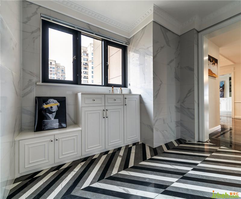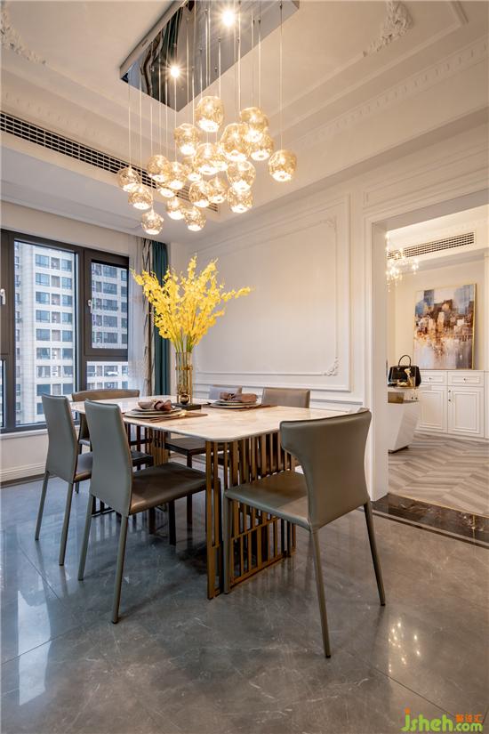 餐廳不再需要傳統(tǒng)的邊吊和射燈,如夢(mèng)幻泡沫般的玻璃藝術(shù)吊燈,一樣可以滿(mǎn)足空間照明,日落黃昏時(shí)的晚餐會(huì)更顯得有浪漫情調(diào),嫩灰色的餐椅、亮黃色的花卉。地面選用灰度太陽(yáng)石系列瓷磚,搭配經(jīng)典黑大理石瓷磚走