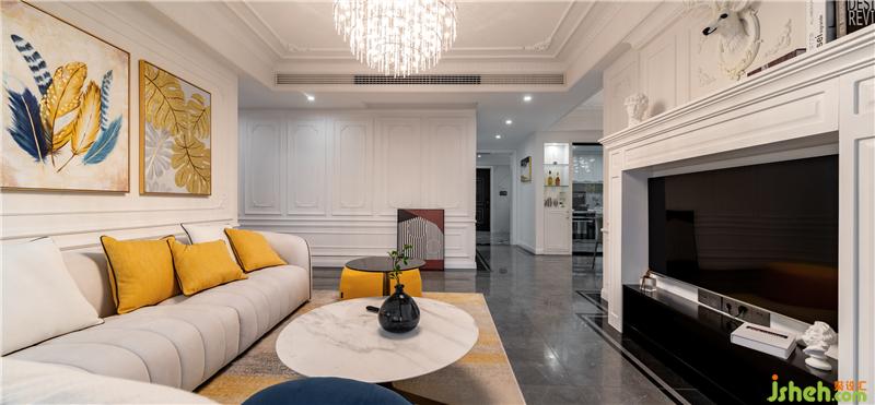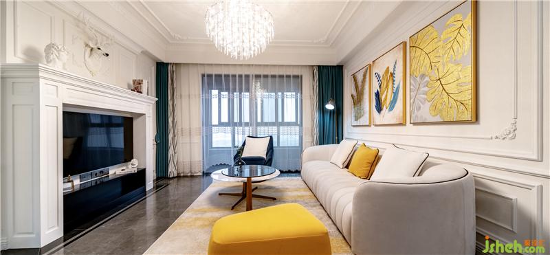 干凈優(yōu)雅的色彩基調(diào)搭配白色調(diào)的壁爐下與黑色電視機(jī)柜,顯得簡(jiǎn)潔而雅致。深色的單人椅呼應(yīng)著空間中的灰度,光線透過(guò)紗簾灑進(jìn)室內(nèi),使得米色沙發(fā)顯得格外溫馨和舒適。