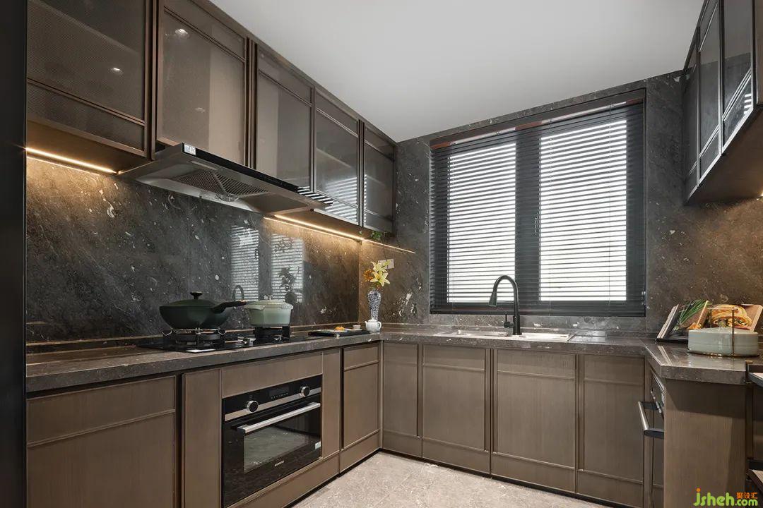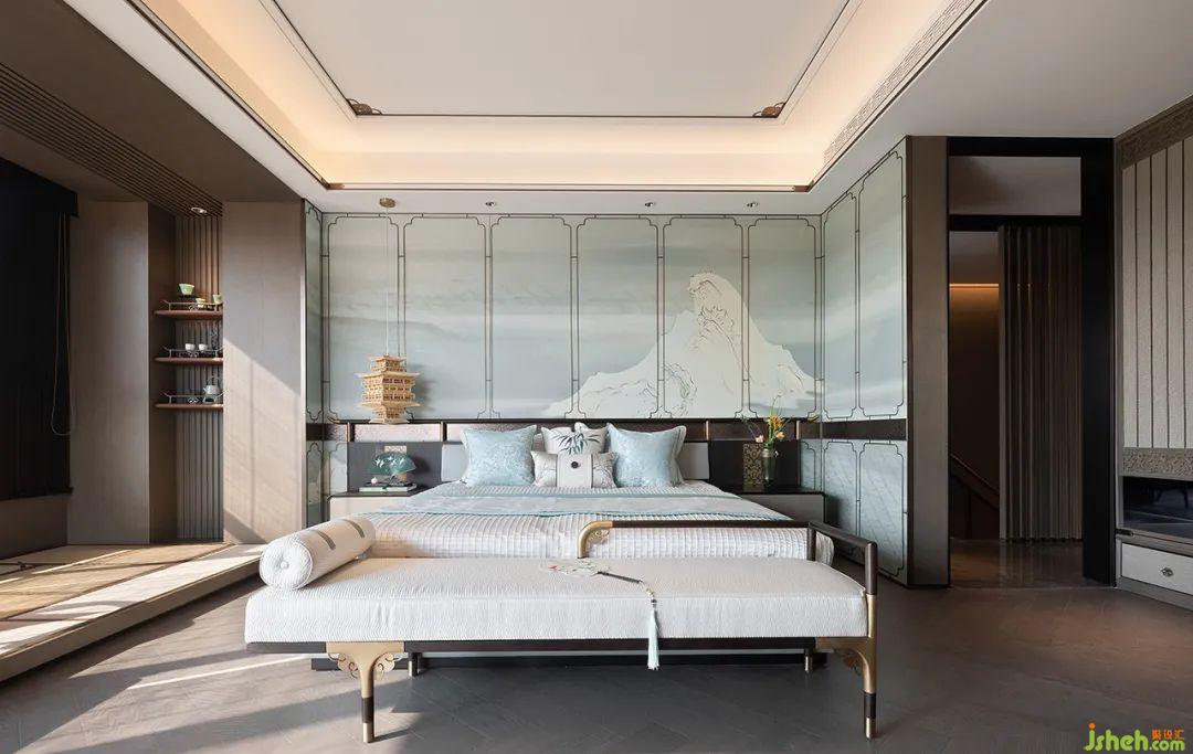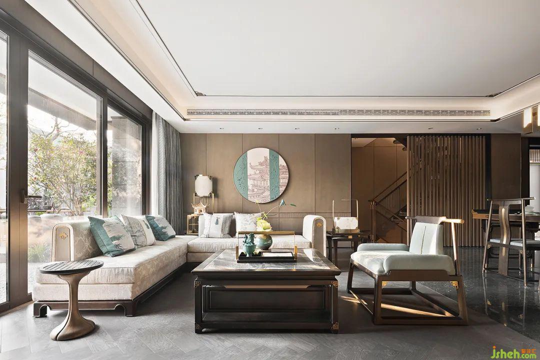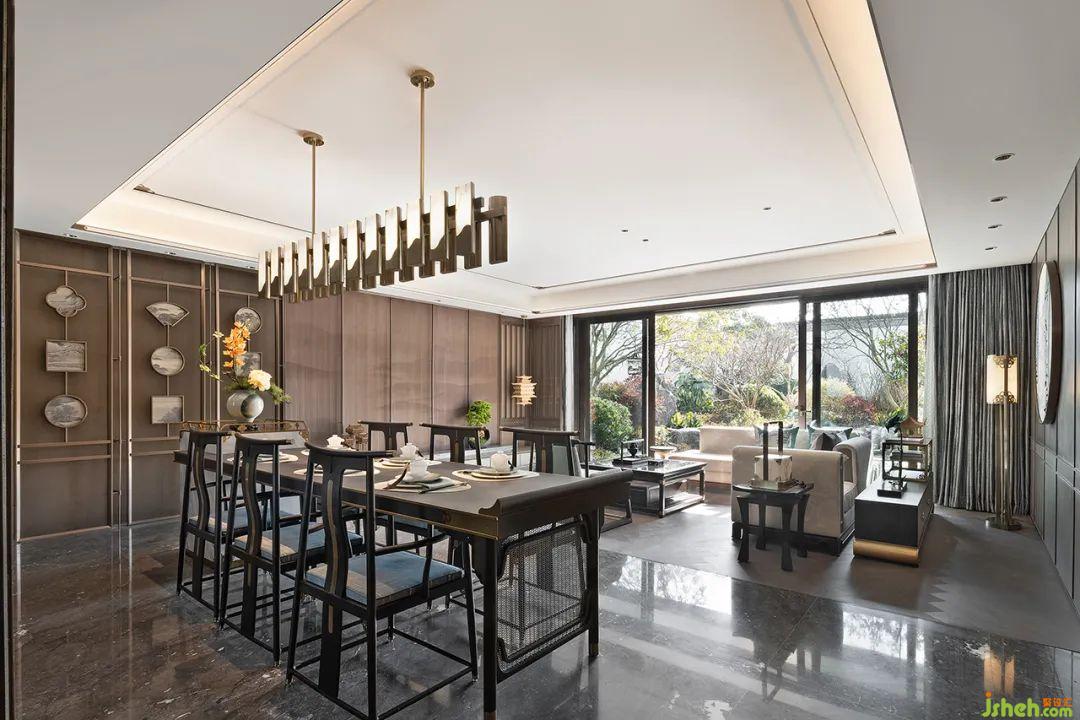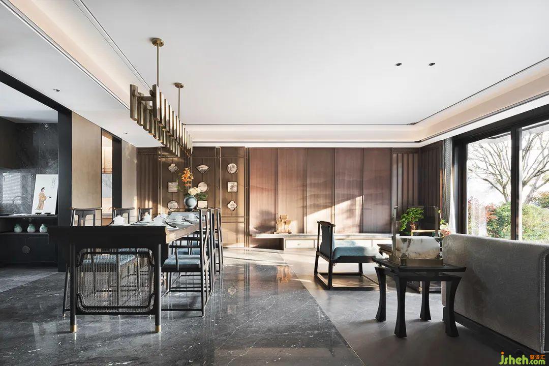 踏入室內(nèi),映入眼簾的是大幅飄窗打通室內(nèi)與戶外景致的視覺聯(lián)結(jié)使之更加開敞,和煦日光,將清幽寫意娓娓道來。室內(nèi)設(shè)計(jì)整體為王府中式設(shè)計(jì),不經(jīng)意間將生活、詩,遠(yuǎn)方連成一體,召喚每一位歸家的人。室內(nèi)整體采用中式元素融入考究而克制的細(xì)節(jié),客廳背景金屬網(wǎng),在里面加上了一副娟絲雕刻的山水畫,其滲透出的遠(yuǎn)山層疊與金屬質(zhì)感的動(dòng)靜相襯,賦予流動(dòng)的語言,增添不同層次的感官體驗(yàn),讓其形成虛與實(shí)的中式意境。