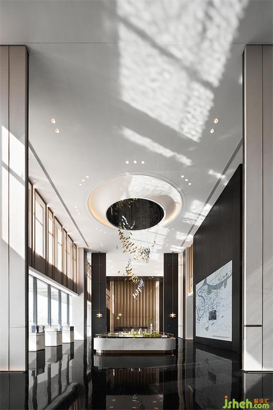 沙盤區(qū)域的流線天花吊燈引入眼簾,如同優(yōu)雅的鳥群,漩渦于空中飛翔,讓空間在視覺上彰顯靈動(dòng),賦予生命力,同時(shí)呈現(xiàn)現(xiàn)代空間的藝術(shù)美學(xué)格調(diào)。