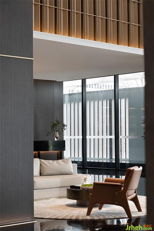 半圍式的洽談區(qū)有效過濾了外界的繁雜又保留獨(dú)立性,使之空間疏密有致而又互相滲透。在大幅玻璃幕墻下的自然光,配合空間選材質(zhì)感,靜默流動(dòng)在光滑的地面,令空間在虛實(shí)相間,遠(yuǎn)遠(yuǎn)看去,仿佛呈現(xiàn)在波光粼粼的海面上。