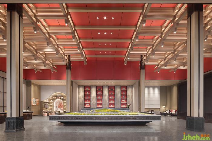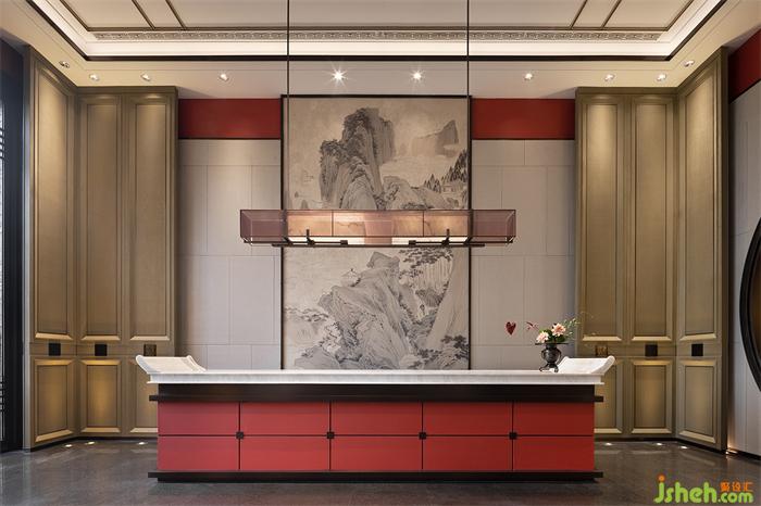 接待前廳,呈現(xiàn)眼前的是明代畫(huà)家仇英創(chuàng)作的一幅絹本設(shè)色畫(huà)《桃源仙境圖》,營(yíng)銷中心設(shè)計(jì)在朱紅色的風(fēng)致里,一展其獨(dú)有的方正拙實(shí)之美,于水墨之意的映襯下,詮釋人文·自然·東方的美學(xué)意境。