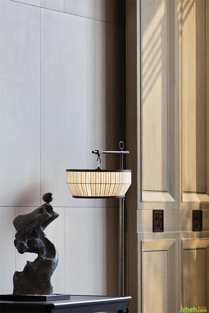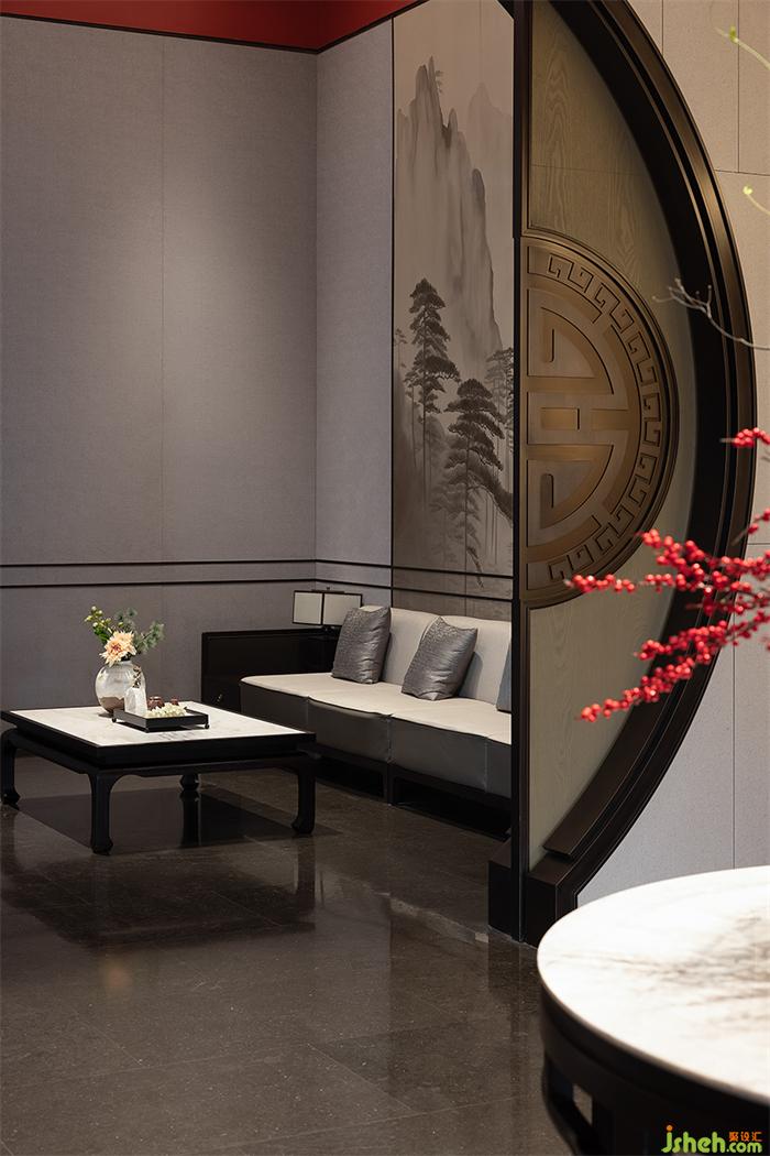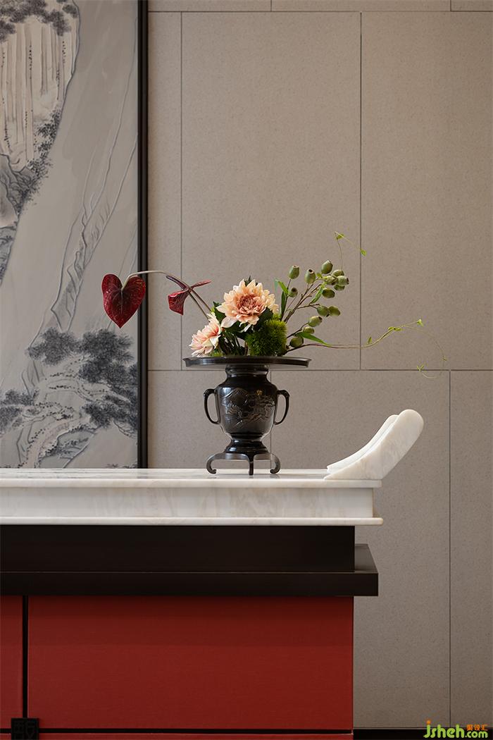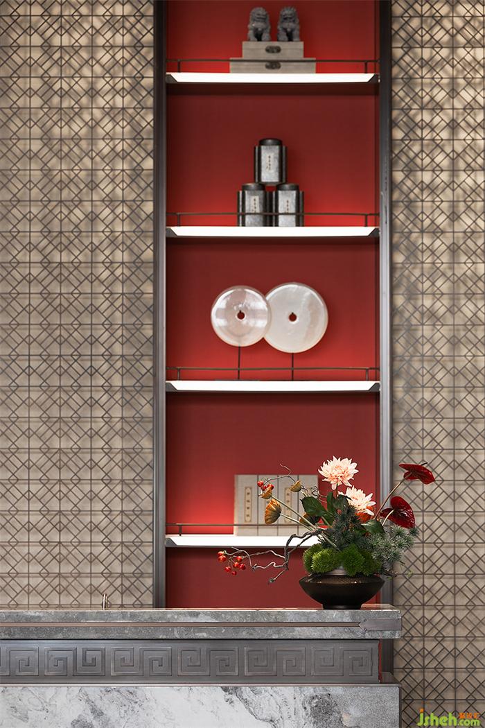 水吧臺(tái)延續(xù)了東方的禮序之美,通過(guò)傳統(tǒng)的金屬花格概括提煉的方式增強(qiáng)空間形式感,營(yíng)銷中心設(shè)計(jì)點(diǎn)綴中式工藝精湛的瓷器、漆器,以及花藝等軟裝藝術(shù)品,讓空間氤氳著人文雅致。