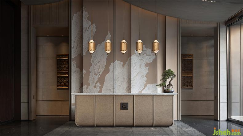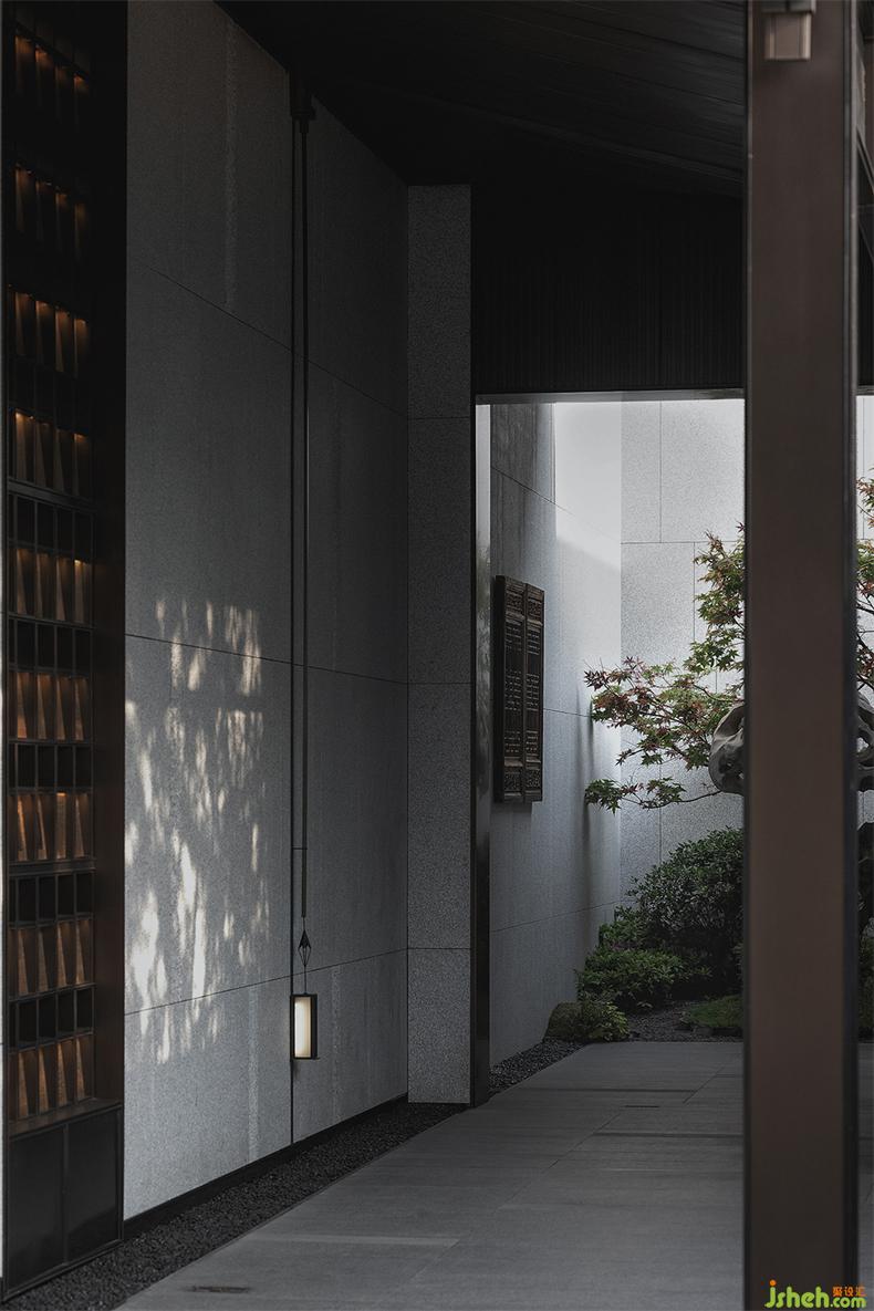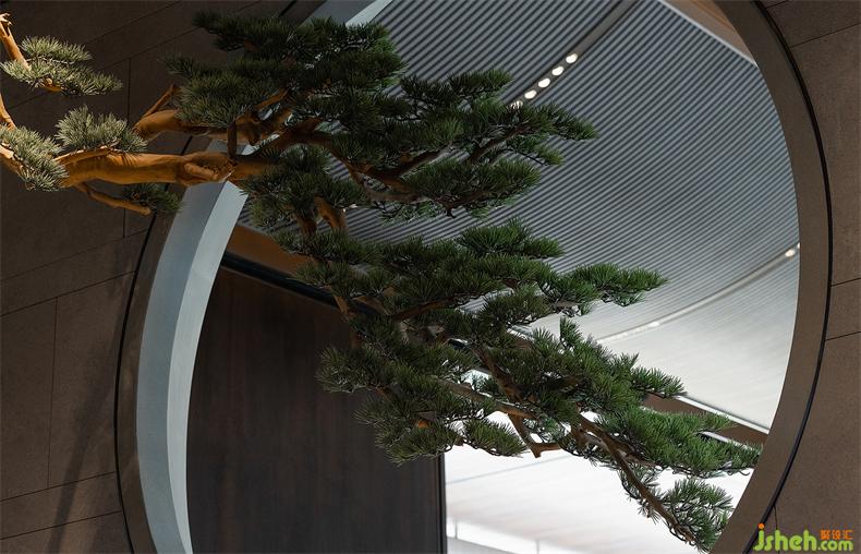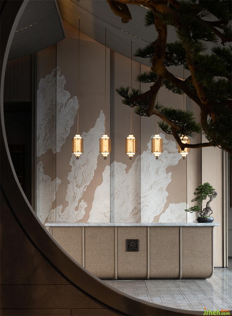 前臺(tái)一側(cè),會(huì)所設(shè)計(jì)以虛實(shí)結(jié)合的手法營造一個(gè)半圍合的空間,一方池水,鏡面澄澈,一枝松枝橫斜,樹影婆娑,一池一樹一景,二維畫卷與三維微觀園林水景互為映照,形構(gòu)出靜謐空間氣質(zhì)。
