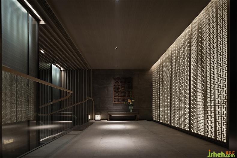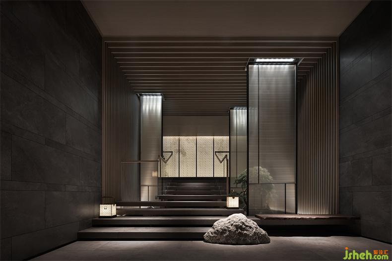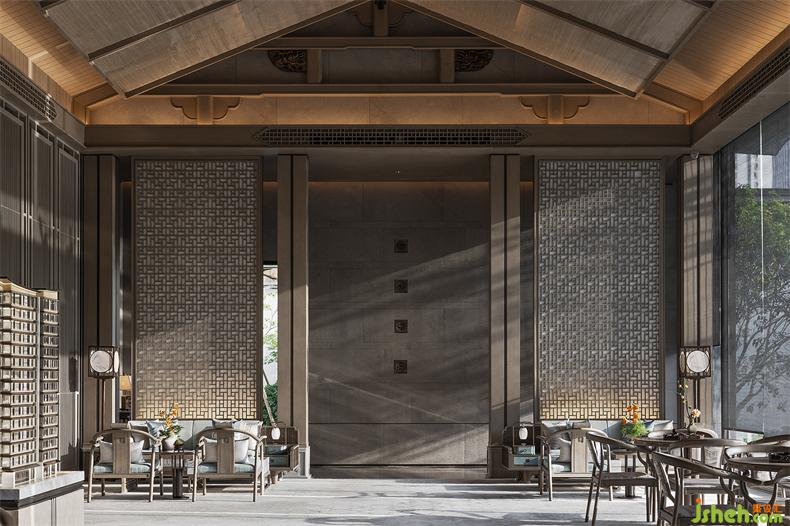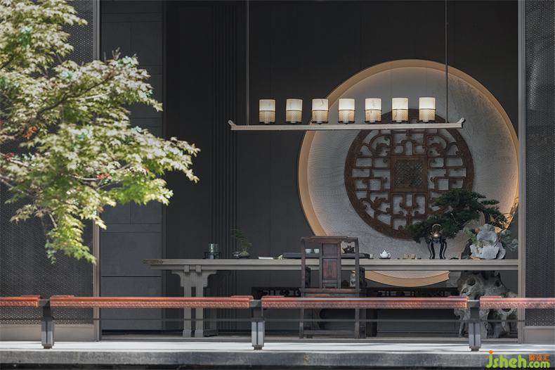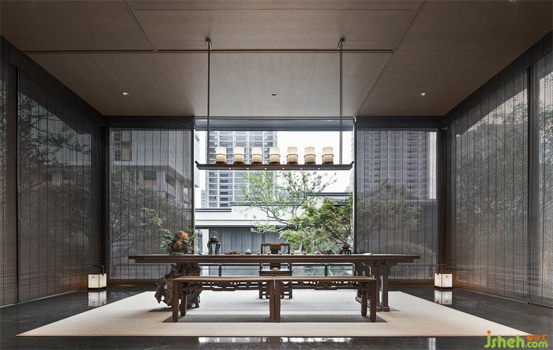 一縷茶煙透碧紗,享慧心之外的茶韻墨香。禪茶區(qū)還原宋茶席規(guī)制,會(huì)所設(shè)計(jì)在流淌的水鏡中呈合圍環(huán)抱之勢(shì),將東方意境恰到好處地彰顯。天花采用萬(wàn)字紋的圖形以現(xiàn)代手法構(gòu)造,四面以金屬格柵圍合,以一種虛的“隔”的方式,傳達(dá)出傳統(tǒng)東方寫(xiě)意,也讓當(dāng)代氣質(zhì)呼應(yīng)而出。在此茗一杯茶,捧一本書(shū),晨沐朝霞,夜觀星斗,咫尺乾坤盡在眼前。