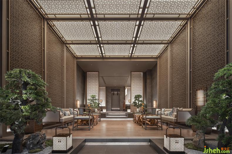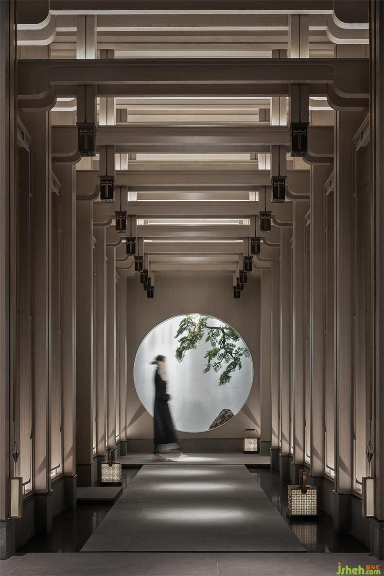 長廊中的天花由中國傳統(tǒng)院落得到靈感和啟發(fā),會所設(shè)計(jì)隱含了北京的四合院和徽派建筑的結(jié)構(gòu)布局。兩側(cè)引水景穿插,中式方形燈籠飾于長廊之內(nèi),一道云紋的石橋序列其中。整體以含蓄的現(xiàn)代方式詮釋東方意境,陳設(shè)置景,簡凝詩意。