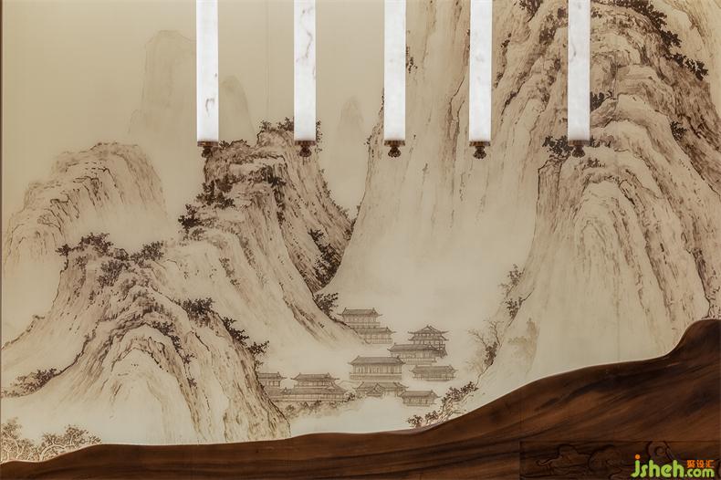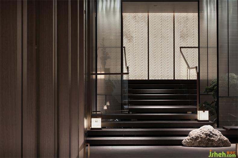 步入地下會所前廳,以臺階形態(tài)為媒介,結(jié)合空間框架及功能進(jìn)行設(shè)計(jì),會所設(shè)計(jì)用簡潔的體塊貫穿延伸于整個(gè)空間。樓梯兩側(cè)是由水紋燈與夾絲玻璃構(gòu)成的山間清泉流水畫境,用非水之水,作微波水漾,在光線下更顯動人靈光。萬字紋下的格柵屏風(fēng)滲透出影綽的竹林清風(fēng),透光幽靜,增添不同層次的感官體驗(yàn)。