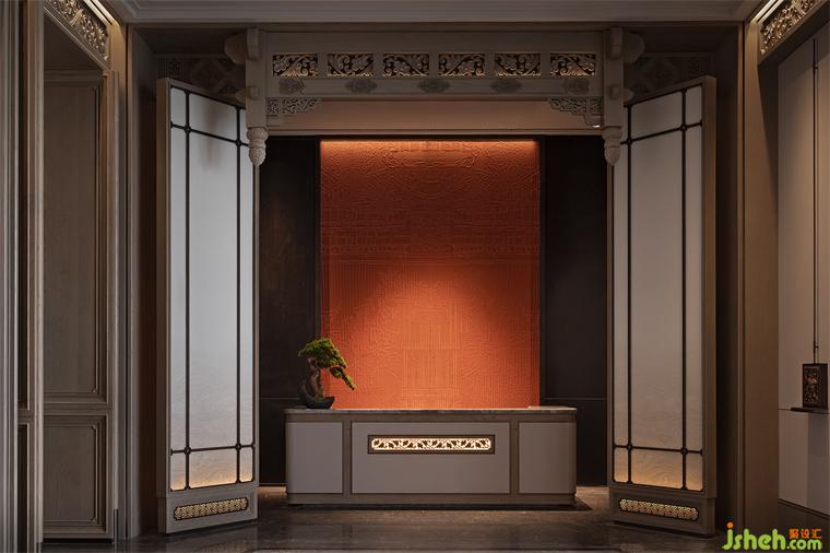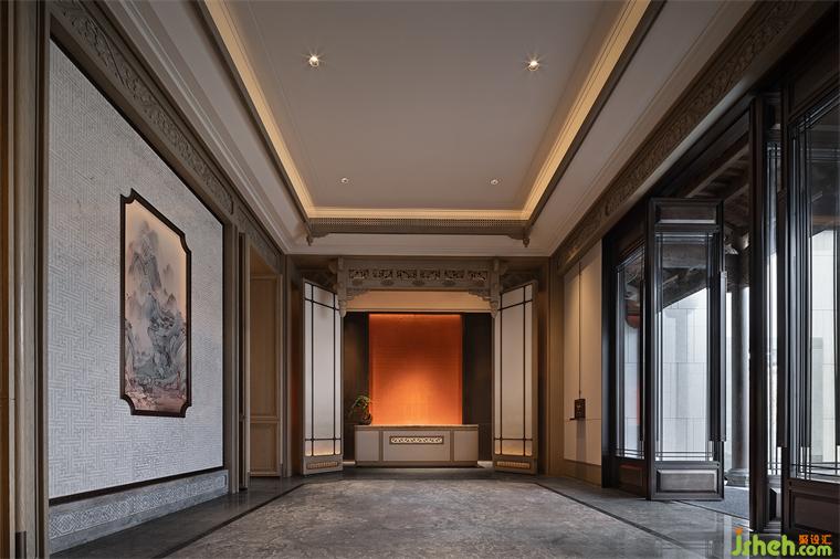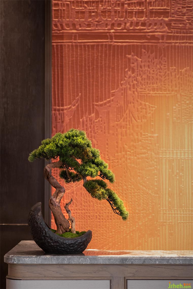 節(jié)奏與韻律可以激發(fā)起人們的美感聯(lián)想,步入光影長(zhǎng)廊材質(zhì)與光影的動(dòng)態(tài)產(chǎn)生交互,長(zhǎng)廊中的地磚由中國(guó)傳統(tǒng)燕尾鎖落得到靈感和啟發(fā),整體空間隱含了徽派建筑的結(jié)構(gòu)布局。兩側(cè)引水景穿插,長(zhǎng)沙會(huì)所設(shè)計(jì)中式方形燈籠飾于長(zhǎng)廊之內(nèi),一道云紋的石橋序列其中。整體以含蓄的現(xiàn)代方式詮釋東方意境,陳設(shè)置景,簡(jiǎn)凝詩(shī)意。