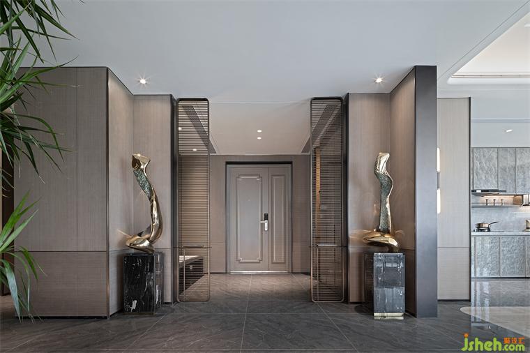 初入玄關(guān)格柵按比例分割拓展了縱深方向的空間敘事穿插肌理感圖案