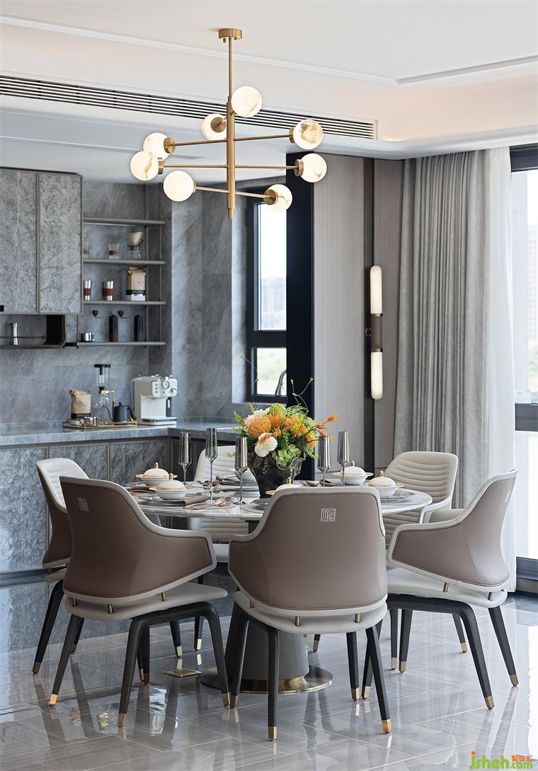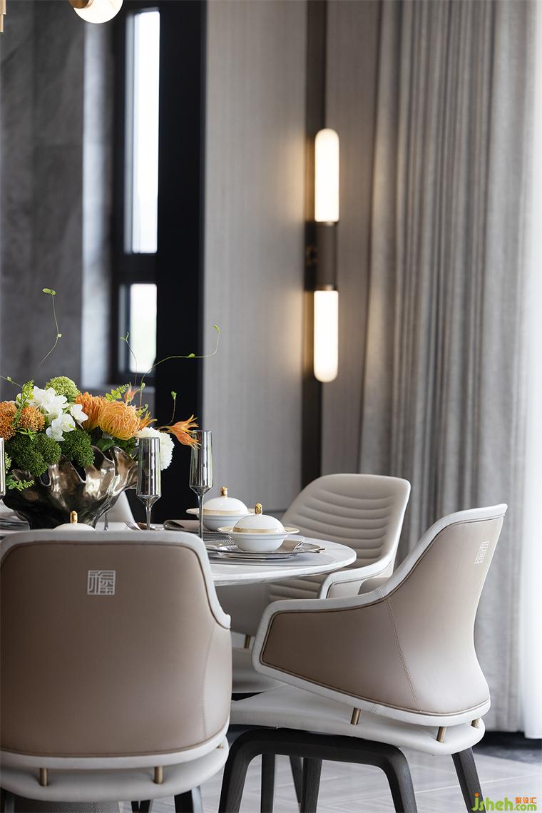 餐廳空間延續(xù)著客廳空間所營造的靜謐自然與清雅。樣板房設(shè)計(jì)雅致的色彩感還原生活最本真的模樣,花器為整個空間帶來了不可多得的呼吸與律動感,自在且隨心。