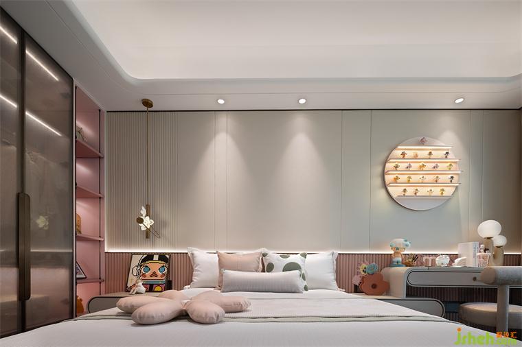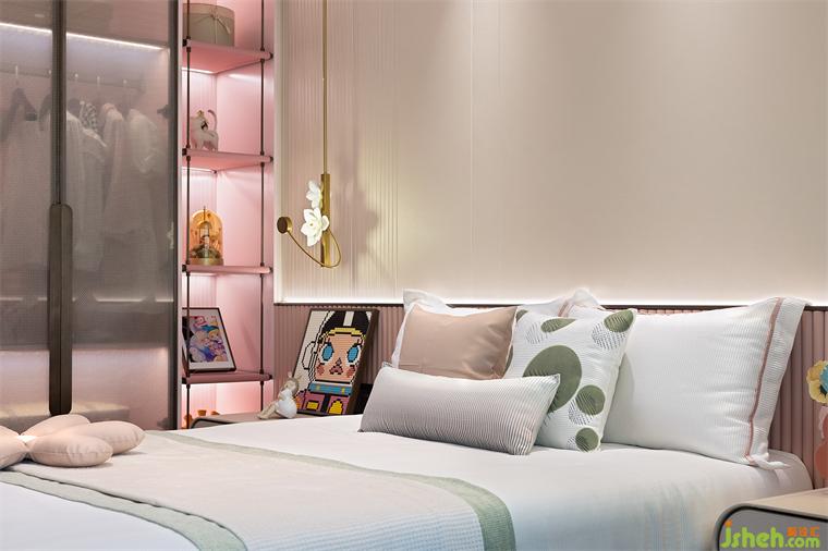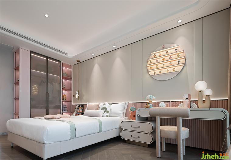 女孩房的色彩趨于柔和甜美。樣板房設計百搭的中性色輔以充滿無窮魅力的粉色,讓整個居室的氛圍都變得浪漫且柔美。