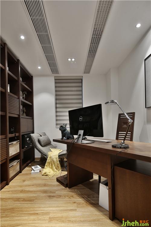 書房的書柜設(shè)計做到有藏有露,既有層次感又方便收納。窗簾設(shè)計的是百葉窗,方便通風。