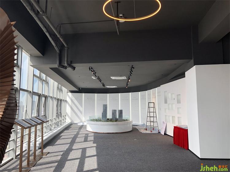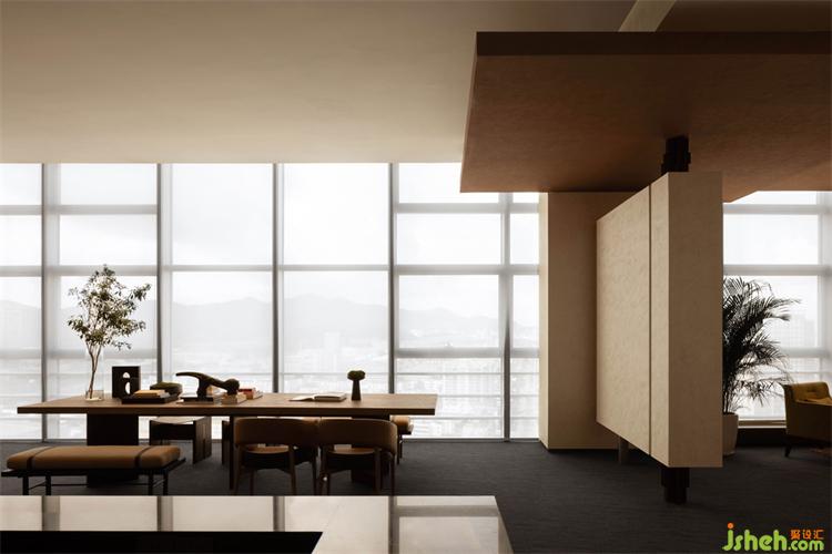 空間位于樓宇19層,整體呈“7”字型,一整個外側(cè)面均為大幅建筑玻璃幕墻,遠眺可達前海之遙。一方面,采光極好,壯美的景色一覽無余,這是其優(yōu)勢所在,另一方面,仁恒前海夢公園售樓處設計提高了室內(nèi)光線控制的難度,考驗塑造空間進深與層次的功力。