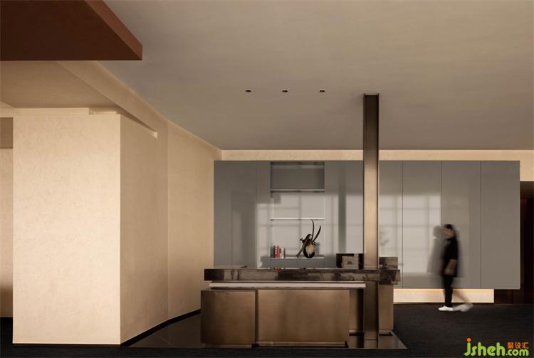 步入前廳接待區(qū),正對整面的玻璃采光,仁恒前海夢公園售樓處設計通過制作石材肌理與木飾面構成的幾何感幕墻,起到空間壓縮的效果,同時控制透入接待區(qū)的光線,并圍合起恰當?shù)慕哟嚯x。利落的幾何體塊奠定了項目的整體空間基調(diào)。水平方向極簡線條的前臺,以古銅色立柱在垂直方向上予以呼應。小的苔蘚山石造景精美而克制,營造沉靜東方氣韻,懸空隔架中鑲嵌屏幕,承擔企業(yè)宣講的功能,并形成步入內(nèi)部空間的區(qū)隔。