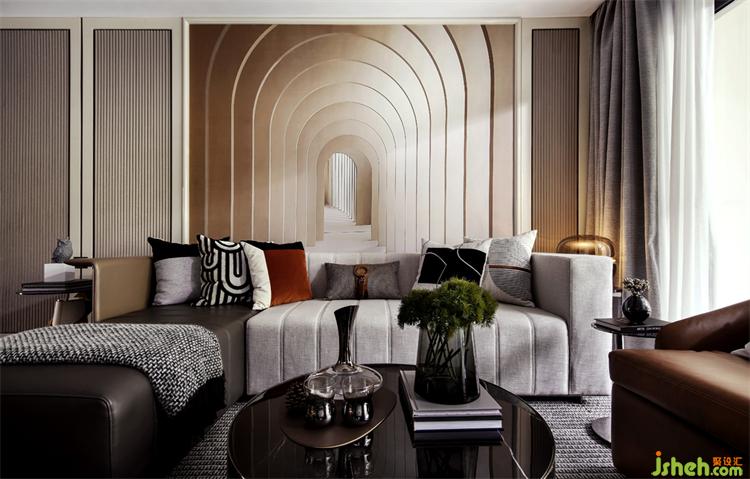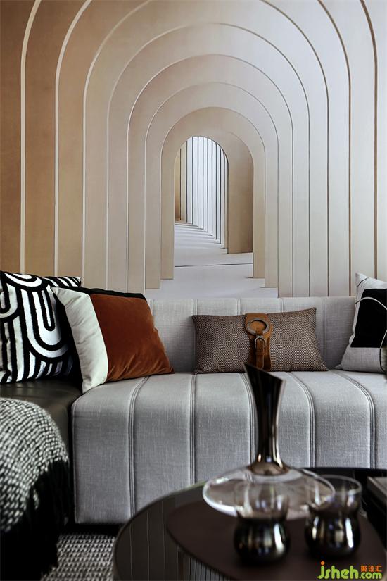 Model House C | 沙發(fā)背景墻延伸感極強(qiáng)的建筑圖案墻紙,包攬了近乎整個(gè)客廳墻面,直接帶出了空間的主旋律??此浦皇呛喴椎膱D案,卻能一眼帶來人們好奇心。廣州亞運(yùn)城精裝樣板房設(shè)計(jì)不斷延伸的門后可有盡頭,而深處潛藏何物,無人得知。如同我們的夢想之路,一切都是那么的不可預(yù)知,而帶著無畏與探索的激情,一切都將日漸明朗。