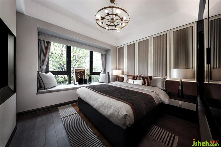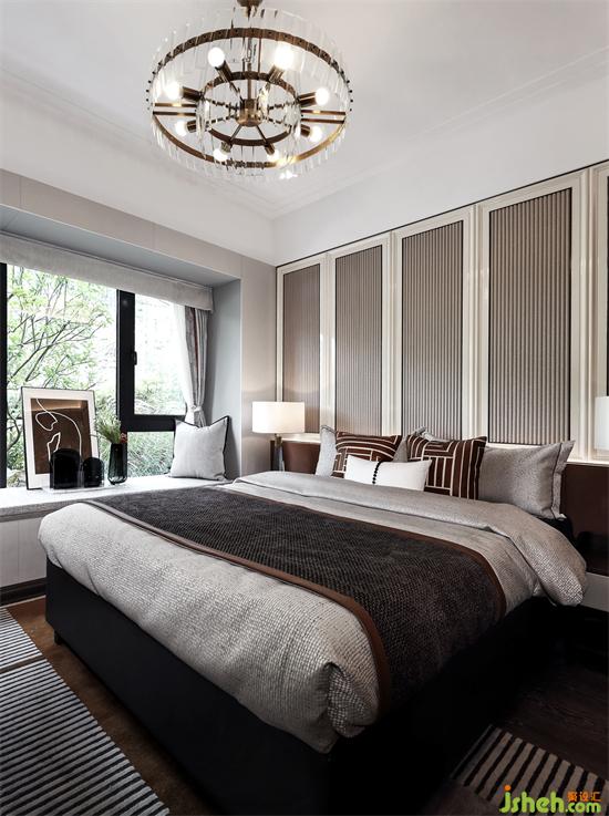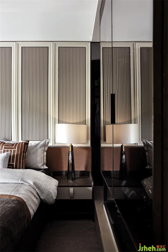 主臥背景墻延續(xù)客廳區(qū)域墻身的設(shè)計(jì),不同色彩與幾何元素的靈活運(yùn)用,廣州亞運(yùn)城精裝樣板房設(shè)計(jì)創(chuàng)造出恰到好處的空間層次,溫暖細(xì)膩的深色木地板,清透明亮的煙灰色玻璃衣柜,搭配質(zhì)感舒適的床品,于無形之中彰顯出主人尊貴的氣度。