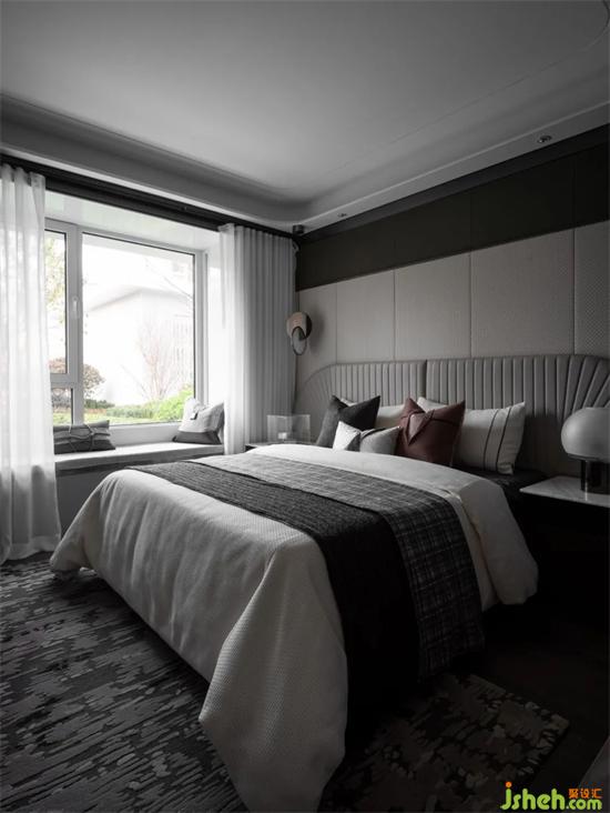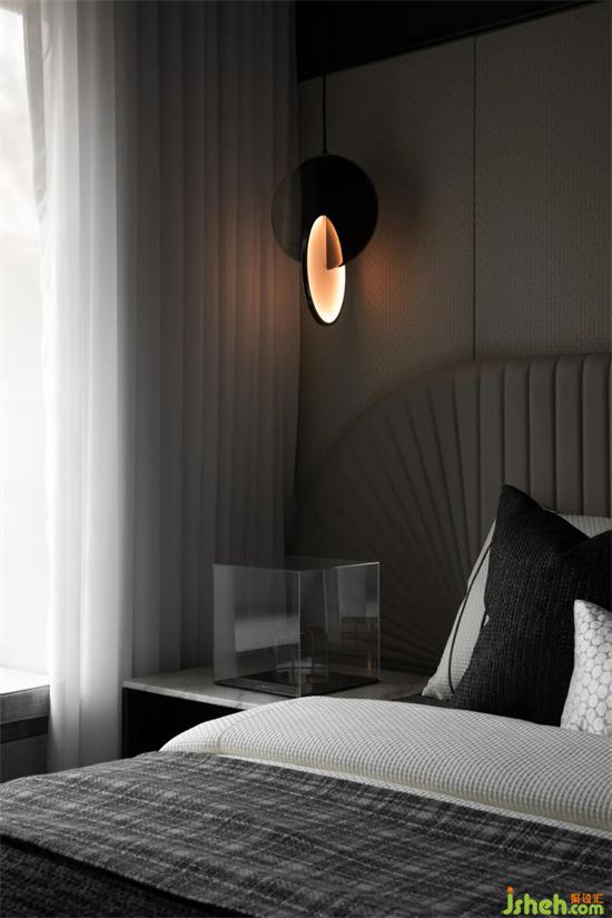 主臥設計運用深淺不一的灰色,營造出簡潔、恬靜的睡眠氛圍,床頭背景墻以不同色塊的皮革組合,搭配線條流暢的扇形床頭靠背,在線與面的交織,碰撞中,創(chuàng)造出和諧的空間秩序和韻律。