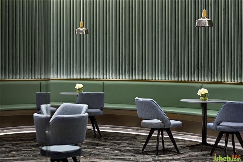 步入咖啡廳,設(shè)計師運用綠色與藍(lán)色,隱喻山與海,在現(xiàn)代建筑中營造自然的氛圍。舒適田園是掙脫現(xiàn)實的一畝良田,喚醒人們對生活本真面貌的追求。室內(nèi)設(shè)計師