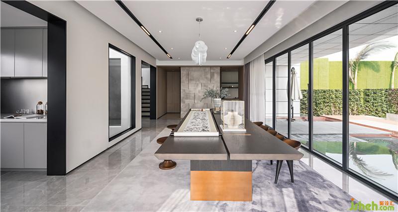 這是一個(gè)充滿流動(dòng)陽光的藝術(shù)空間。通過水汀石階步入整座建筑,分隔內(nèi)外的不是厚重的墻壁而是橫貫書畫廳的玻璃幕,能夠?qū)⒆貦皹涞木G色和??诘娜粘鋈章溆橙霃d內(nèi)。