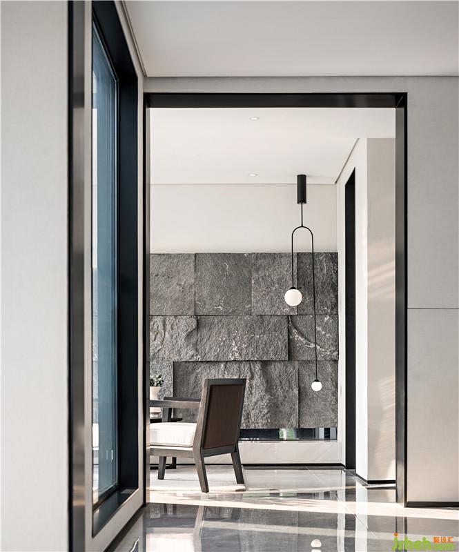 外圍的玻璃幕以及內(nèi)部的大量玻璃材質(zhì)運(yùn)用,在勾勒出各個(gè)區(qū)域結(jié)構(gòu)和線條的同時(shí),保留了空間的整體感,讓人目之所致盡是協(xié)調(diào)與統(tǒng)一之美??蛷d墻壁用原始巖石肌理更突顯了藝術(shù)家對(duì)自然對(duì)原始的渴望。