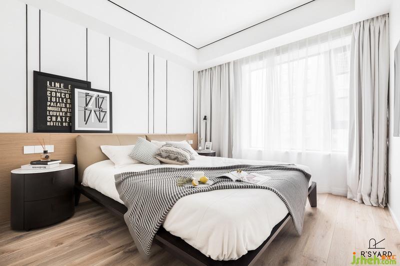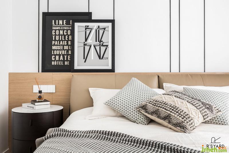 軟裝配飾方面,室內(nèi)設(shè)計(jì)師沒有按照傳統(tǒng)方式在床背景中央掛畫,而是選擇了兩幅小的黑白畫,斜靠在背景一側(cè)。