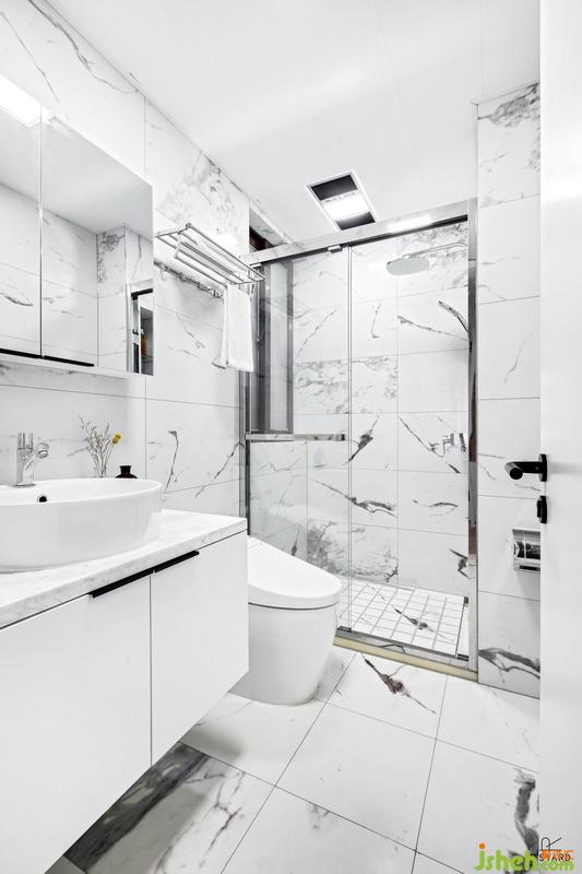 廚房我們同樣以白色為主色調(diào),黑色線條做點(diǎn)綴,配上地面的幾何花紋,時(shí)尚且酷。