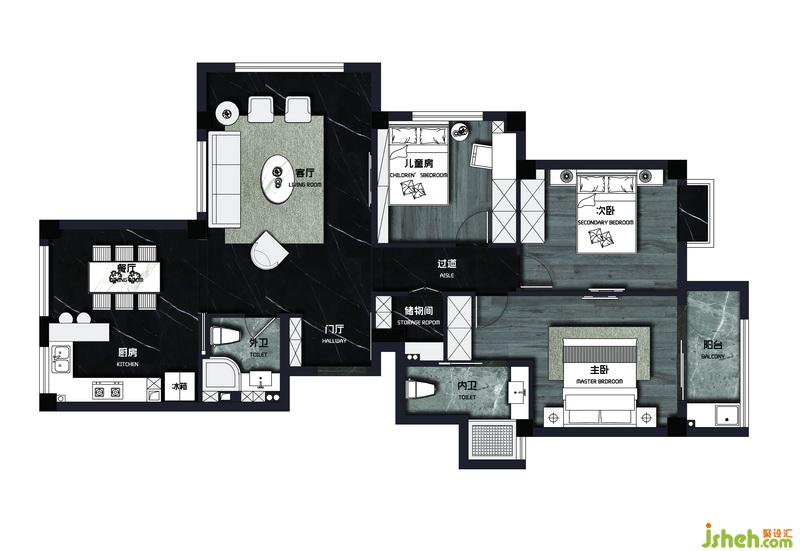 主要材料:黑色不銹鋼烤漆,木飾面,大理石瓷磚,木地板,黑白根大理石