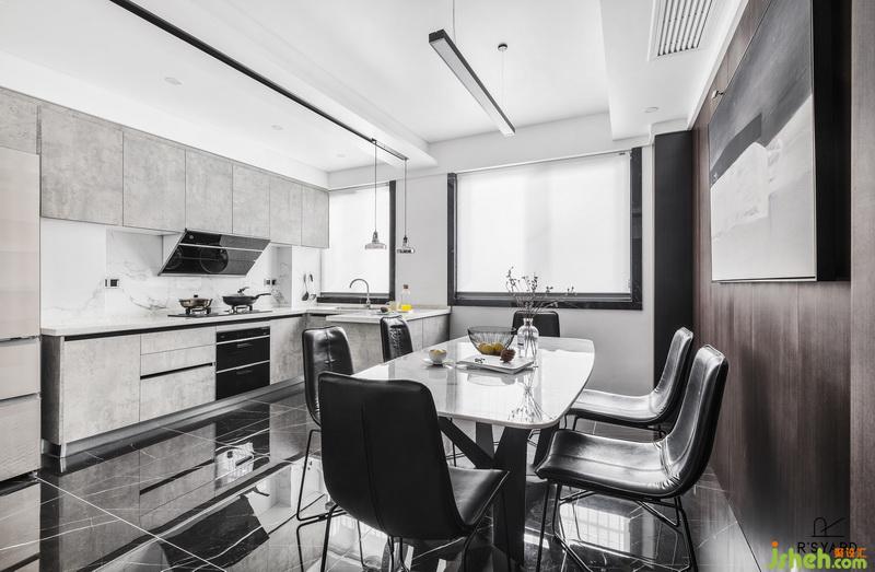 開放式的廚房與餐廳相連通,讓原本擁擠的廚房和餐廳,變得寬敞通透。而油煙問題,室內(nèi)設(shè)計(jì)師則在餐廳和客廳相連接的地方做了一道暗門隔斷。餐廳的吊頂有一道梁,于是我再這個(gè)倒梁下加了一條的不銹鋼長(zhǎng)條框,使原本平淡的吊頂增加了一絲趣味與結(jié)構(gòu)感。