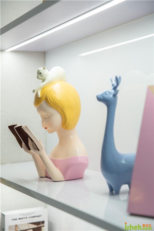 柜板中間加以明亮燈光,為整體空間增加采光度,簡(jiǎn)約而明快。萌趣裝飾畫、可愛玩偶和粉色抱枕等飾品共同營(yíng)造了一個(gè)童真又溫馨的小世界。