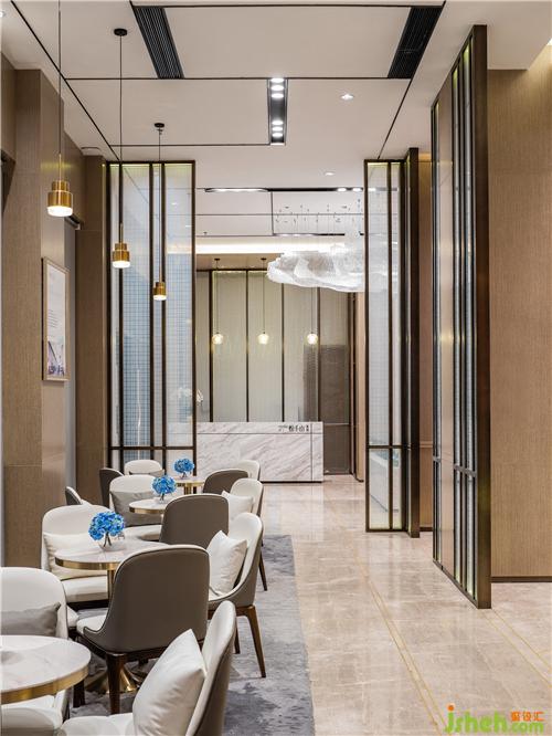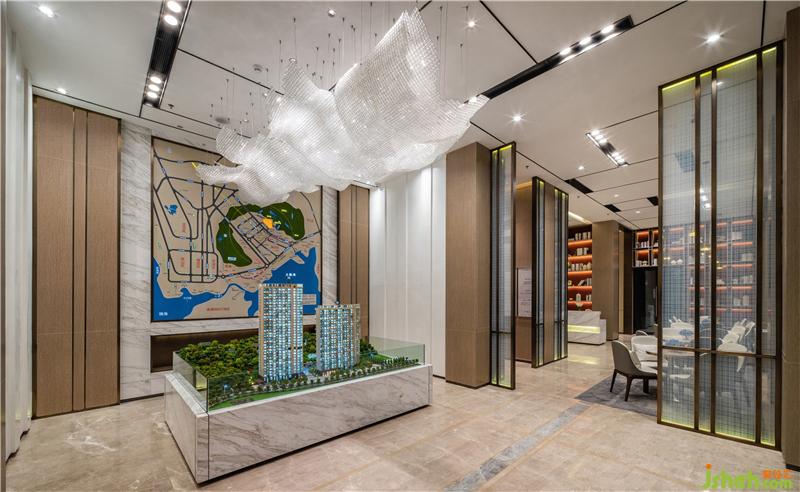 售樓處設計師結(jié)合當?shù)亟5奶厣崛×藵O網(wǎng)作為吊飾的設計元素,抬頭一瞬,仿佛可以體會到漁夫撒網(wǎng)那一刻對收獲的渴望之情,恰似來賓到此所含的期許心情,以及對未來美好生活的憧憬。