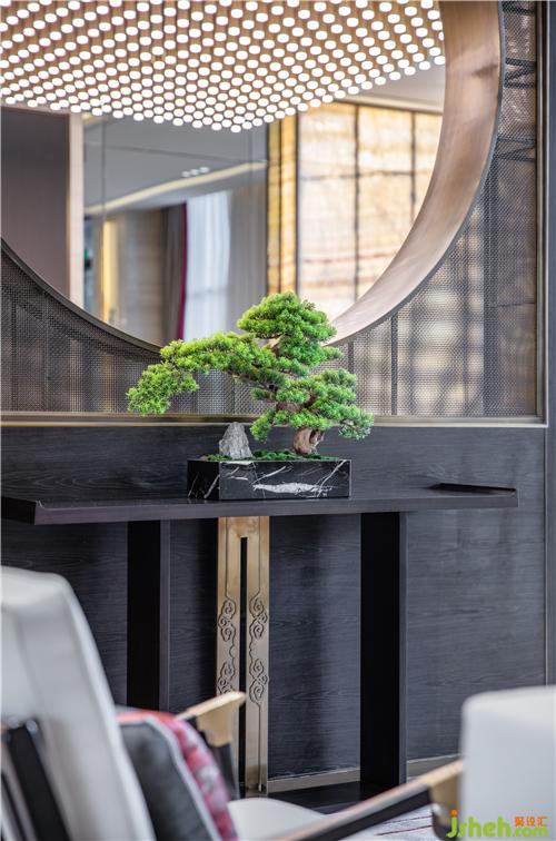 圓形門洞,框出幽遠(yuǎn)寧?kù)o的畫面,引人入勝,吧臺(tái)上擺放著寓意迎客松盆景,售樓處設(shè)計(jì)傳達(dá)空間屬性,歡迎賓客前來參觀。