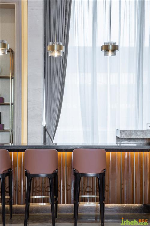水吧區(qū)讓空間清雅靜謐,吧臺(tái)上方的燈具采用玻璃金屬造型,現(xiàn)代感的設(shè)計(jì)加上皮革座椅,在東方氛圍的基礎(chǔ)上增添了些許現(xiàn)代氣質(zhì)。