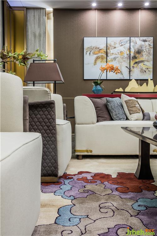 走入客廳,瑞吉木紋大理石作底,加以胡桃木飾面,輔以靈動(dòng)的彩墨畫(huà),綴以錯(cuò)落有致的藝術(shù)品,襯以卡其色打底的祥云地毯,樣板房設(shè)計(jì)渲染出“山氣日夕佳,飛鳥(niǎo)相與還”的詩(shī)情畫(huà)意。