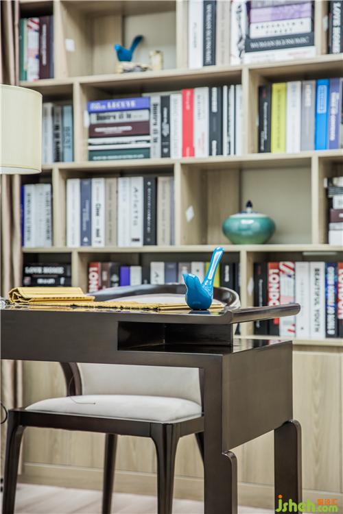 書(shū)房延續(xù)了客廳的詩(shī)意飾品,深色書(shū)桌上精巧燈具的擺放,琳瑯滿目的書(shū)柜中予以文雅風(fēng)韻的瓷器品點(diǎn)綴,散發(fā)出亦古亦今的層次之美。