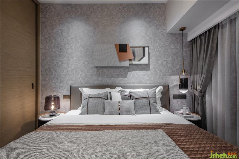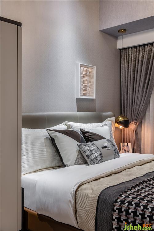 在主臥中,設(shè)計(jì)師用米灰色為主色調(diào)搭配胡桃木色家具,低調(diào)而內(nèi)斂,床頭一幅拼接的藝術(shù)掛畫(huà),用純粹的對(duì)比色塊,理性的線條勾勒出空間的力量美感。