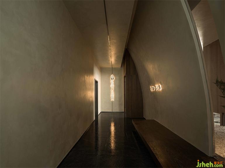 從踏出電梯間,情緒的轉(zhuǎn)換已然開始。入口處與室內(nèi)通過弧形墻面相隔,內(nèi)凹的形狀似乎將人懷抱。通過燈光、材質(zhì)的對比,東方山茶茶室設(shè)計用簡單而含蓄的表達讓客人未進其門,已聞其調(diào)。