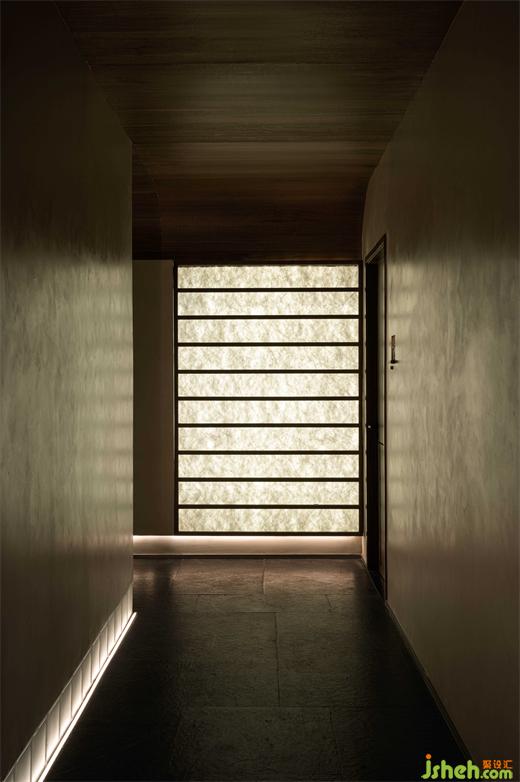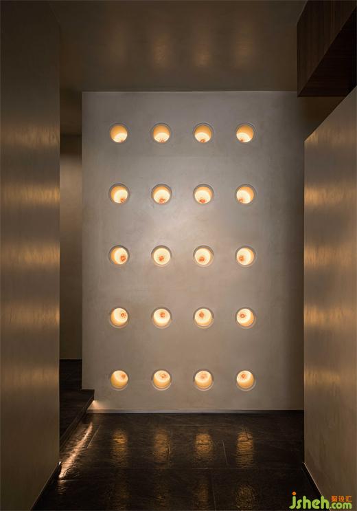 Once you go out of the elevator, the change of emotion starts. The entrance and inner room are departed by an arc wall, and the indent shape seems like hugging people. Using the contrast of light and material and simple and implicit expression make people feel the atmosphere before entering.