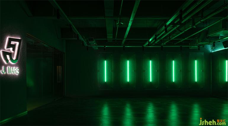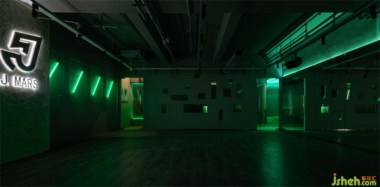 門頭的體塊之間呈現(xiàn)出來的虛實關系,不單是滿足讓學員有記憶點,更旨在引發(fā)新來學員的好奇和探索欲。街舞工作室設計項目是在寫字樓里面,這一層的商戶也是由辦公為主,整體環(huán)境是很商務的,根本讓人聯(lián)想不到HIP-HOP文化、自由、律動、創(chuàng)意,所以門上方的懸浮燈箱和門廳的發(fā)光亞克力條凳都是旨在用光去調動來客的情緒轉換。