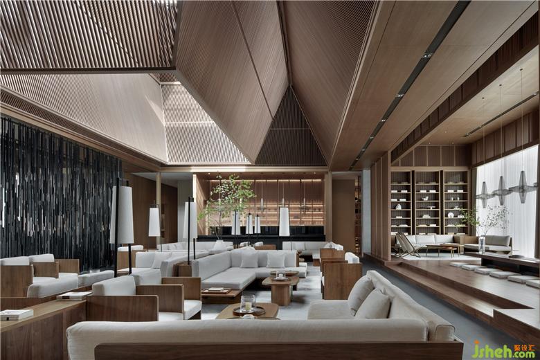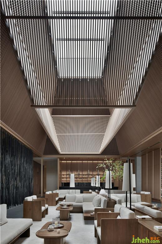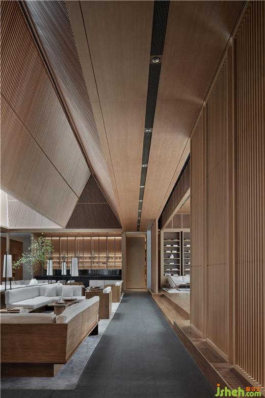 構(gòu)架的頂部吸收并運用了中國古典殿閣與井亭的“盝頂”建筑造型樣式,形成四角上揚收合的形態(tài),凸顯出生命氣息與能量聚合的理念,同時在聚合的頂部留出可呼吸的天窗氣口,充分地吸納天地靈氣和流轉(zhuǎn)的太陽光線。從而形成“舍”的傾斜式頂部結(jié)構(gòu)部分?!氨J頂”的運用,產(chǎn)生出高低起伏、聚合離散的空間節(jié)奏,也營造出林泉丘壑、山野幽僻的悠遠意境。