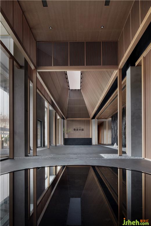 整座建筑的外圍為大面積的水景環(huán)繞,設(shè)計(jì)師順勢也將水的概念自然地導(dǎo)入室內(nèi),枯山水和靜水水缽的運(yùn)用為空間帶來“溪花與禪意,相對(duì)亦忘言”的空靈意境。清澈的流水散發(fā)出空空聲響,于清靜處浸潤人心。