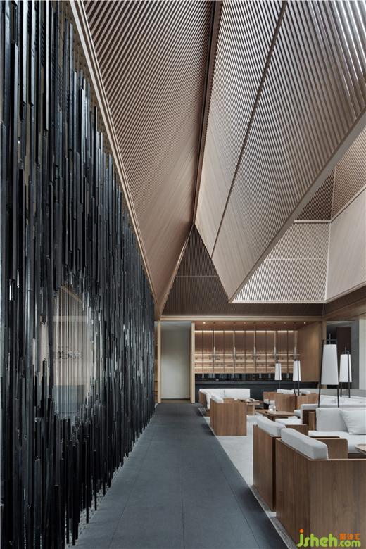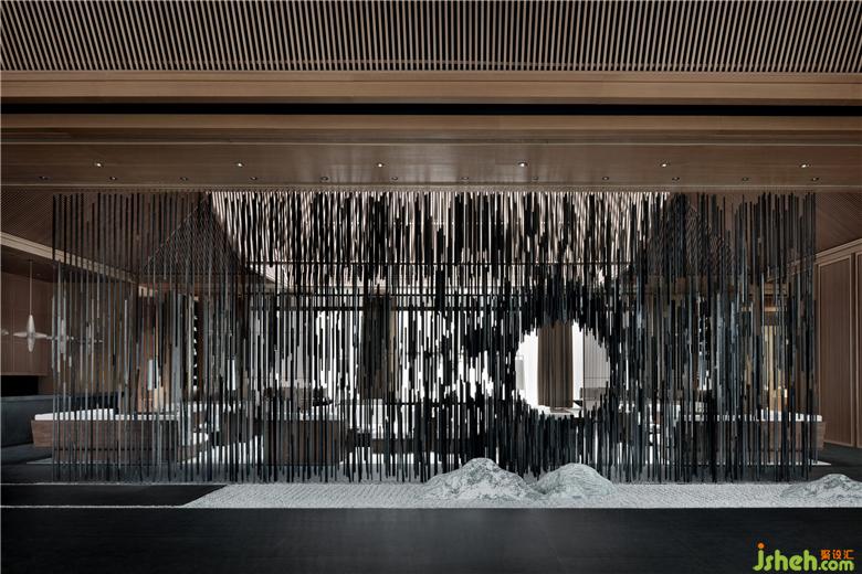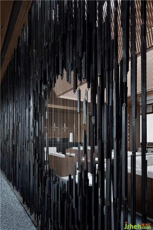 在入口門庭處與主要的深度洽談區(qū)間虛隱意象。設(shè)計(jì)師使用這樣的當(dāng)代藝術(shù)視覺元素探尋中國傳統(tǒng)的精神文脈,延續(xù)著以意取象之間,設(shè)計(jì)師特別設(shè)計(jì)了一面大型的藝術(shù)裝置隔斷,隔斷由密集的炭燒木條以縱向的排列組合橫向延展而成,進(jìn)一步的傳達(dá)出“竹密豈妨流水過”及“四面竹樹環(huán)合”的空間虛隱意象。