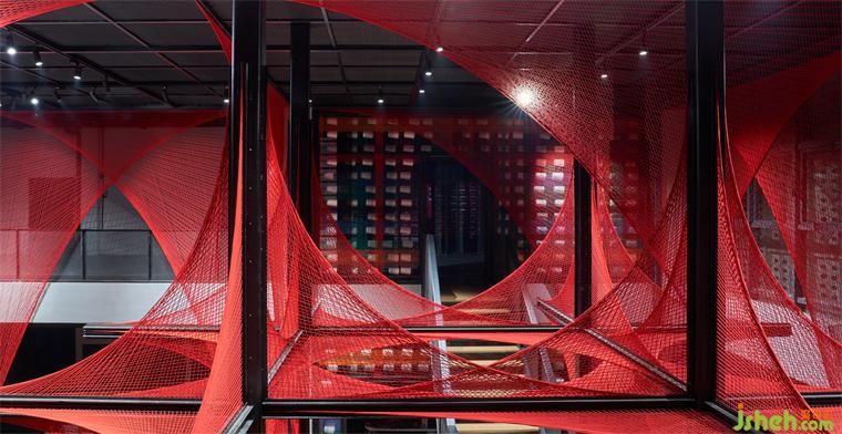 中央?yún)^(qū)域外,設(shè)計(jì)使用白橡木、肌理漆、金屬網(wǎng)、水磨石等簡(jiǎn)潔材料。藝術(shù)博物館裝修設(shè)計(jì)在灰黑空間基底上,立面和頂大量使用白色紗錠與五色彩線陣列交縱,以此對(duì)外圍空間進(jìn)行半遮蔽,將空間視覺焦點(diǎn)始終引向中央。
