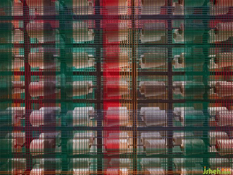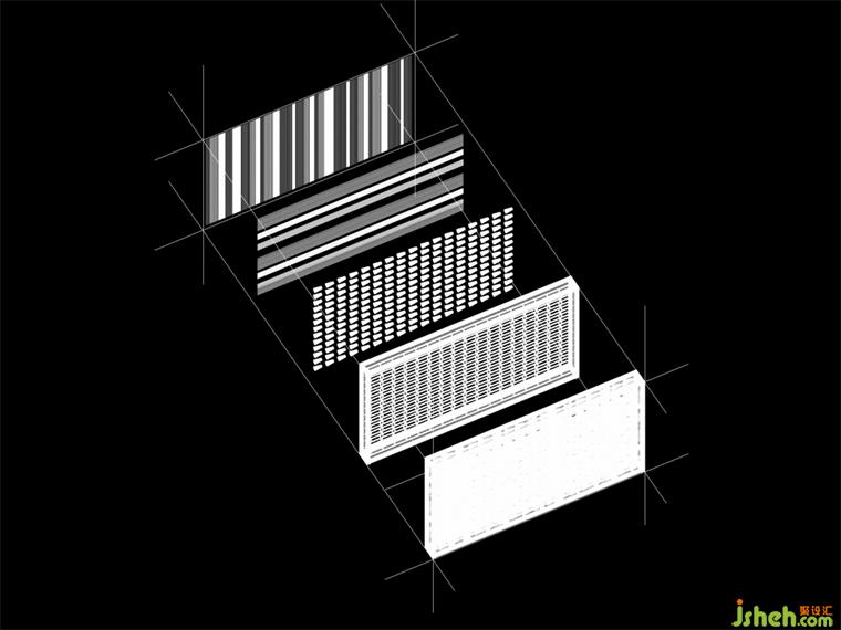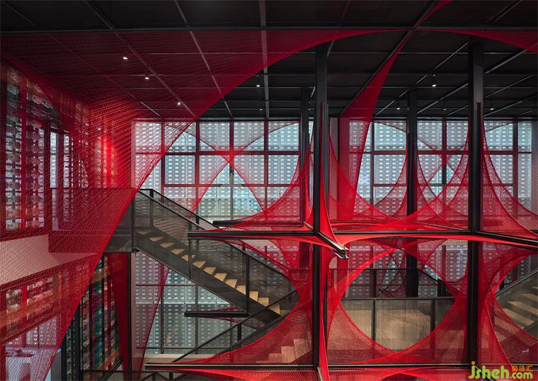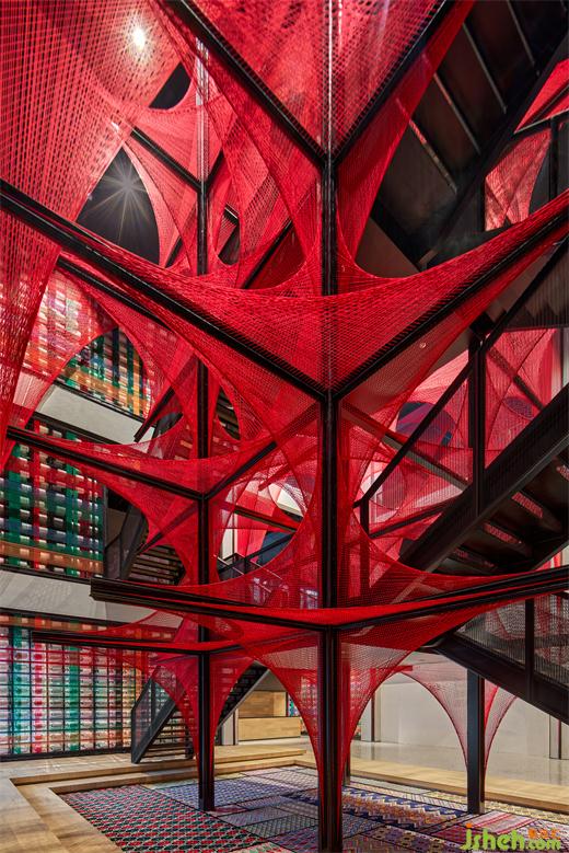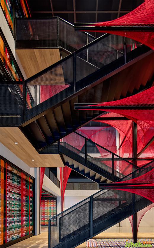 垂直交通由兩組鋼制樓梯折線上升打通,并通過(guò)兩處位于裝置中心的平臺(tái)連通,使樓梯與中心裝置形成互看、融合。藝術(shù)博物館裝修設(shè)計(jì)工業(yè)屬性的樓梯線性結(jié)構(gòu)來(lái)自西蘭卡普紋樣中的六邊形,并同時(shí)應(yīng)用在外圍鋼結(jié)構(gòu)的鏤空形上。當(dāng)精微的圖形浮出,展開成超乎經(jīng)驗(yàn)的宏大,空間場(chǎng)所的矛盾與張力將呼喚新的想象。