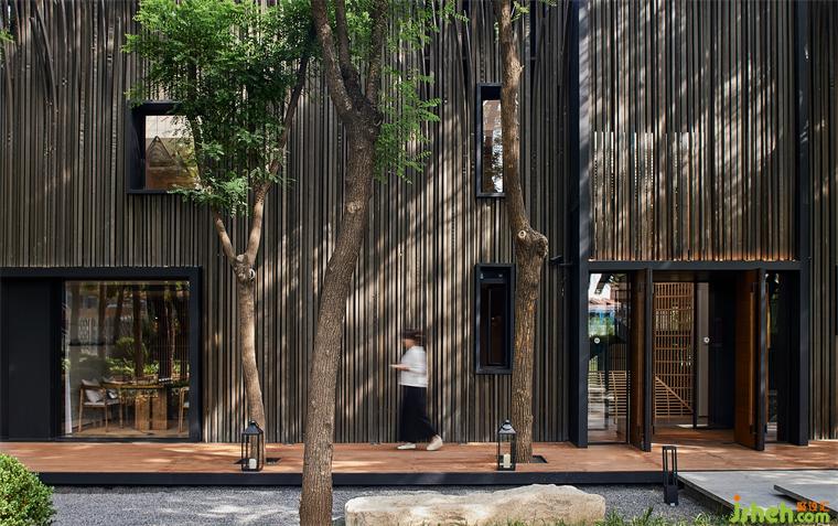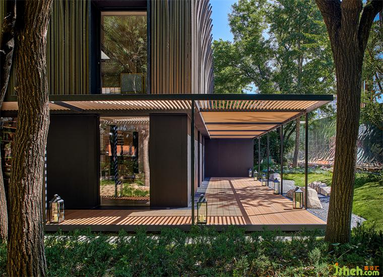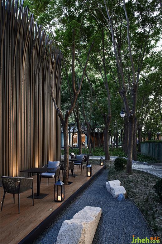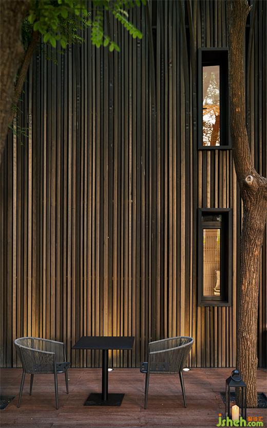 由于原建筑與室外環(huán)境直接相連,又因地勢陷落而困頓突兀,茶空間設(shè)計(jì)以建筑為核心,將周圍景觀向外推離4米,并向下挖掘與建筑齊平,形成一條在外部環(huán)繞的過渡帶,將公共區(qū)域與主建筑柔軟相隔。建筑則向外延伸出2米地臺,對應(yīng)立面條形窗圍合木格柵連廊,茶座散落。
